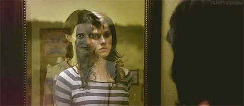 Wpatrywała się we mnie z takim dziwnym wyrazem twarzy. Potem usłyszałam śmiech brata na dole, potem mówił wieloma językami i głosami. Przeraziłam się. Odeszłam od lustra nie odrywając wzroku od kobiety.